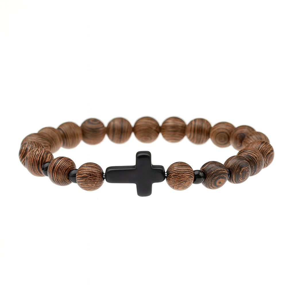 Κομψό και διαχρονικό, αυτό το αντρικό βραχιόλι συνδυάζει φυσικά ξύλινα στοιχεία με μοντέρνο design. Οι στρογγυλές χάντρες διαμέτρου 8mm διαθέτουν όμορφη υφή ξύλου, ενώ στο κέντρο ξεχωρίζει ένας μαύρος σταυρός που προσδίδει ιδιαίτερο χαρακτήρα. Χάρη στο ελαστικό κορδόνι, εφαρμόζει άνετα σε κάθε καρπό.