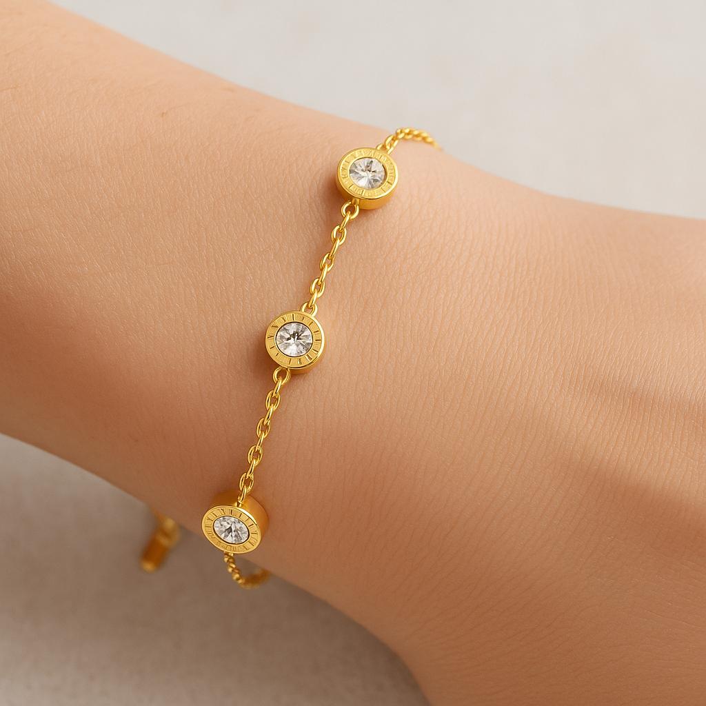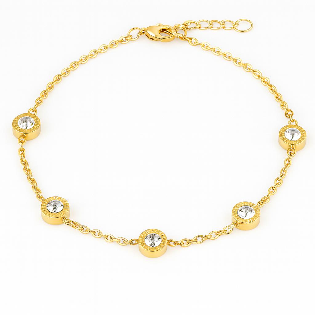 Ένα λαμπερό κόσμημα που συνδυάζει κομψότητα και διαχρονικό στυλ. Το βραχιόλι διαθέτει λεπτή αλυσίδα με πέντε κυκλικά στοιχεία διακοσμημένα με λευκά στρας, ιδανικό για να φορεθεί μόνο του ή συνδυαστικά.
