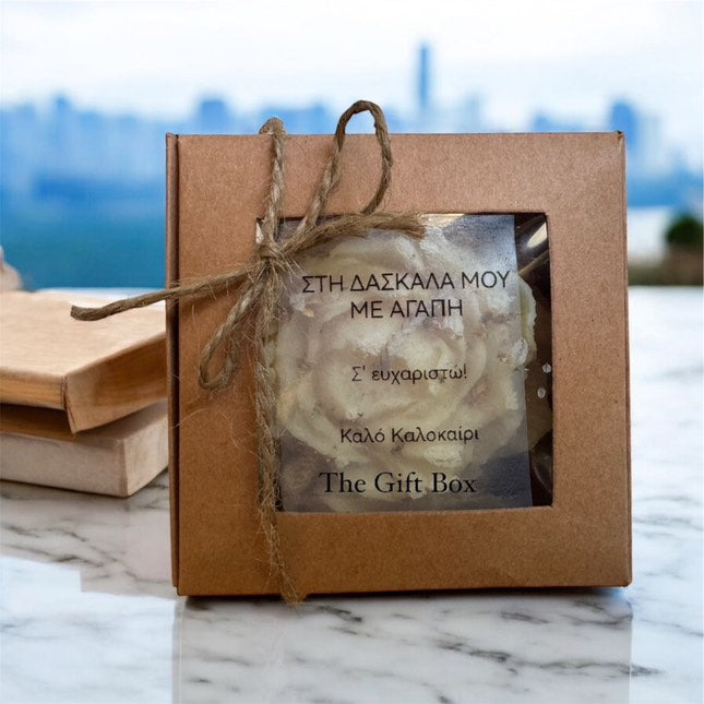 Αυτό το λευκό, χειροποίητο κερί παιώνιας και διακοσμητικά φύλλα χρυσού είναι φτιαγμένο για να τιμήσει την πιο ξεχωριστή δασκάλα. Η συσκευασία περιλαμβάνει το μήνυμα: