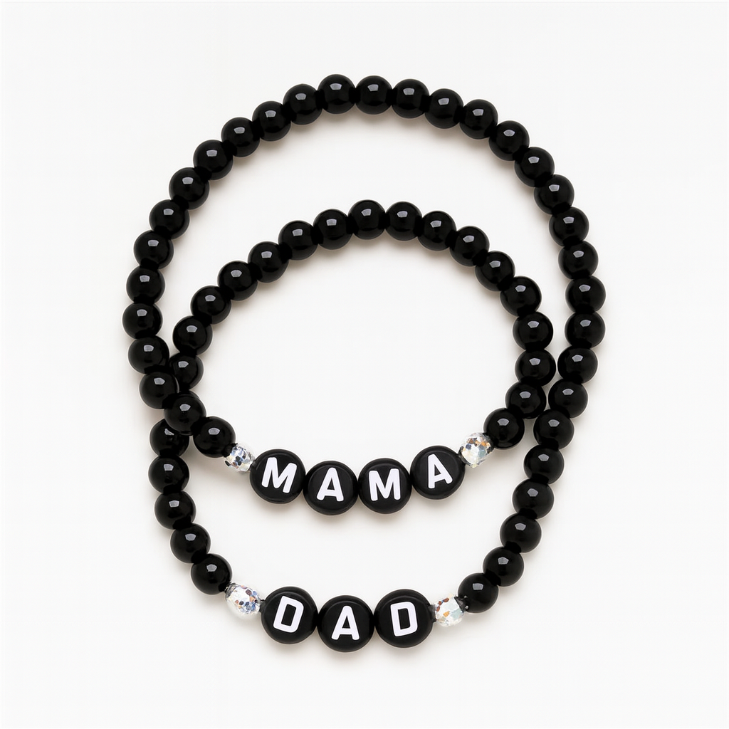 Ένα σετ γεμάτο συναίσθημα, για τους πιο σημαντικούς ανθρώπους στη ζωή μας. Αυτά τα χειροποίητα βραχιόλια με μαύρες γυαλιστερές χάντρες και γράμματα “MAMA” & “DAD” είναι ο πιο γλυκός τρόπος να δείξεις την αγάπη σου.