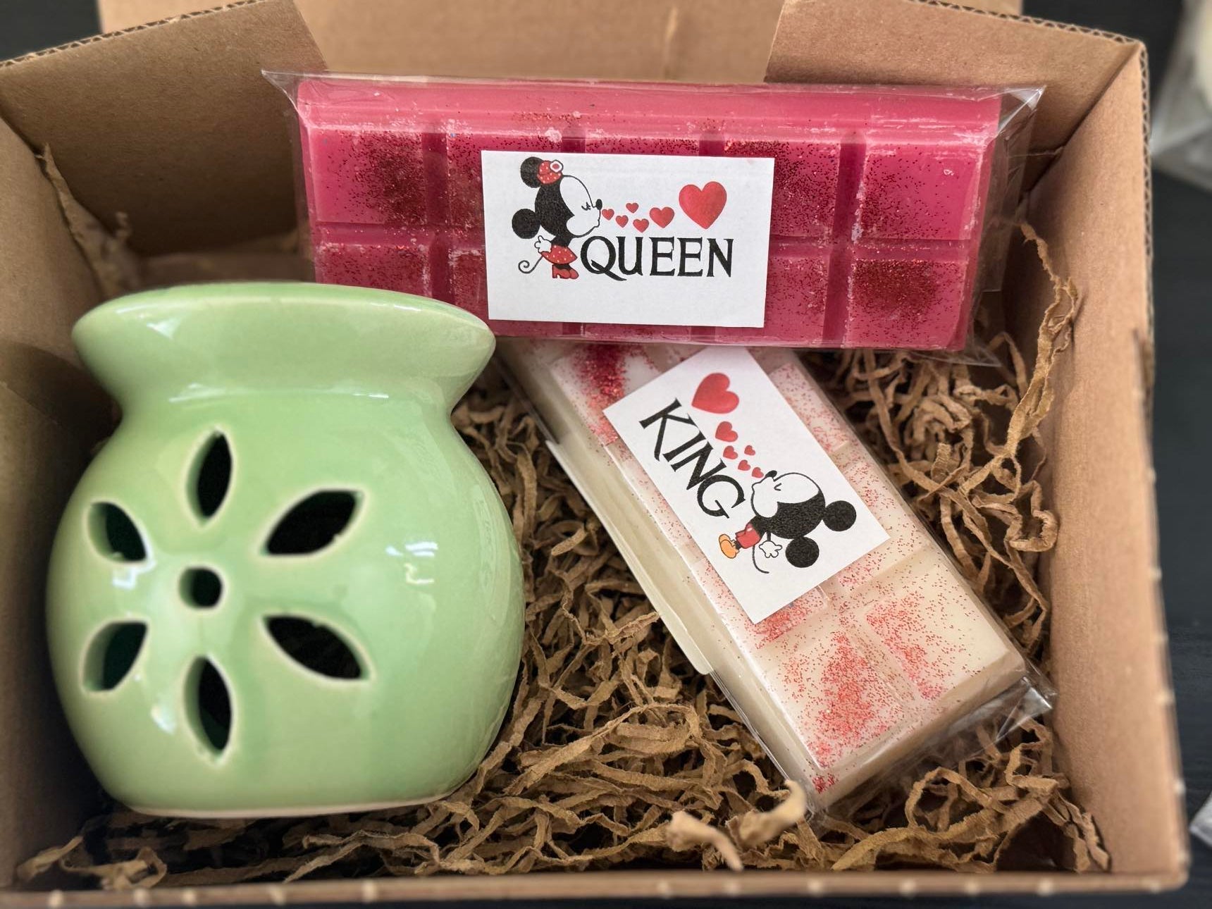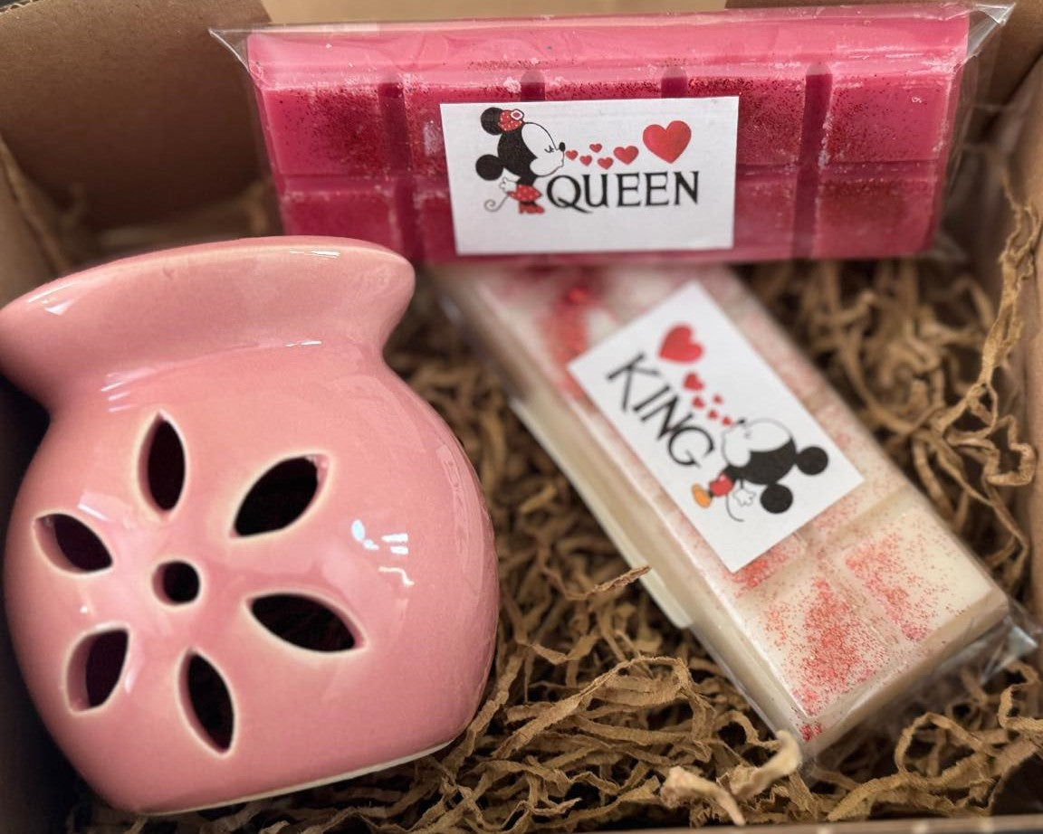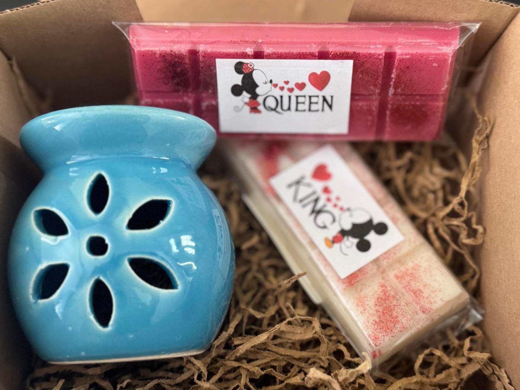 Σετ δώρου για ζευγάρια που περιλαμβάνει έναν κεραμικό αρωματιστή και δύο μπάρες σοκολάτας.