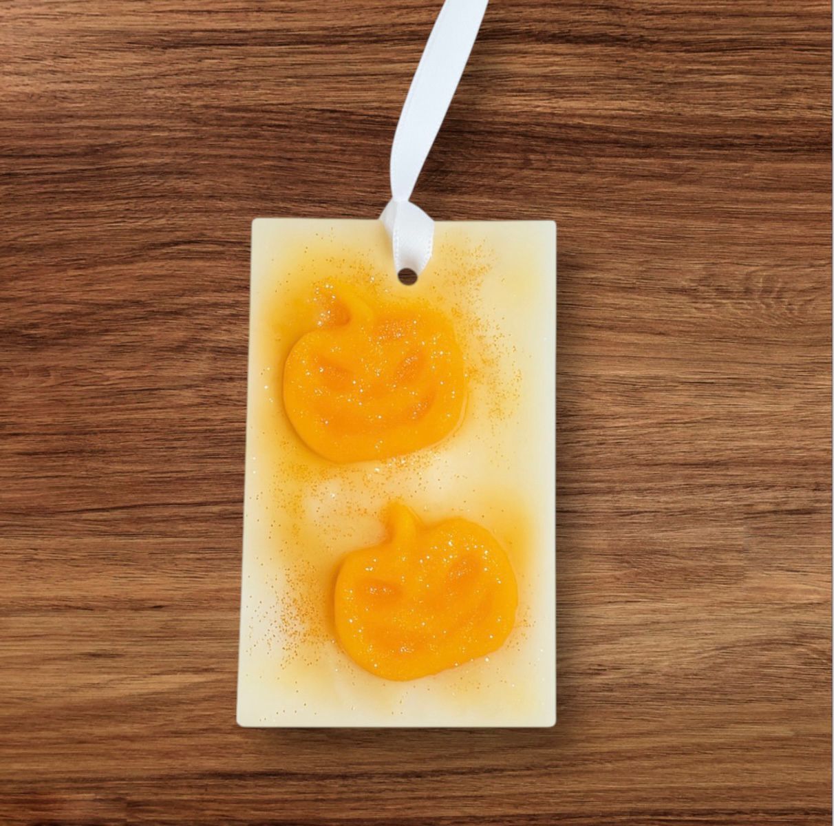 Δύο χαμογελαστές / τρομακτικές κολοκύθες ζωντανεύουν πάνω σε αυτή τη χειροποίητη ταμπλέτα από 100% φυτικό κερί σόγιας, έτοιμες να σκορπίσουν φθινοπωρινή μαγεία στον χώρο σας.